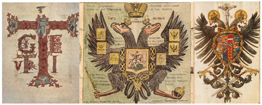 На гербе православной России главным в Троице Божией милости выступает Дух: большая корона венчает не раздвоенные головы единого символа богатства и власти, но мир невидимый – славу.
