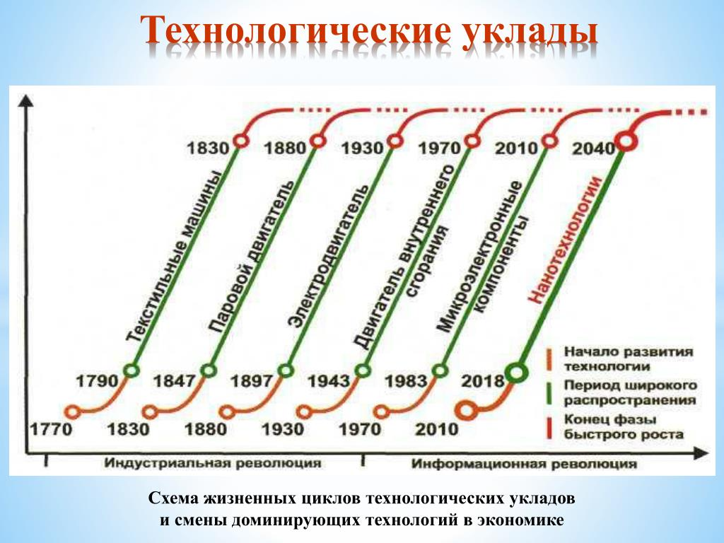 В наше время человечество живет на переходе из 5-го (микро-электроника, компьютеры) в 6-й цифровой уклад экспансии ИИ (NBIC-конвергенции). 7-ой технологический уклад волновых технологий духовной сферы придет после 2040 года.